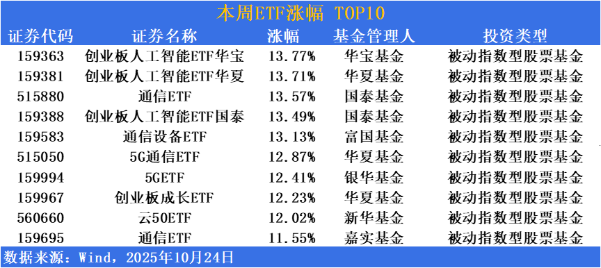 随着重磅会议落幕,其传递的未来五年规划的关键信号引发市场高度关注。中信建投强调“新质生产力”首次纳入全会规划框架,人工智能作为这一轮科技革命的重要抓手,有望迎来新的发展机遇。涨幅前十的ETF中科技主线也再度回归。创业板人工智能ETF华宝(518860)、创业板人工智能ETF华夏(159381)、通信ETF(515880)等多支产品涨幅超13%。