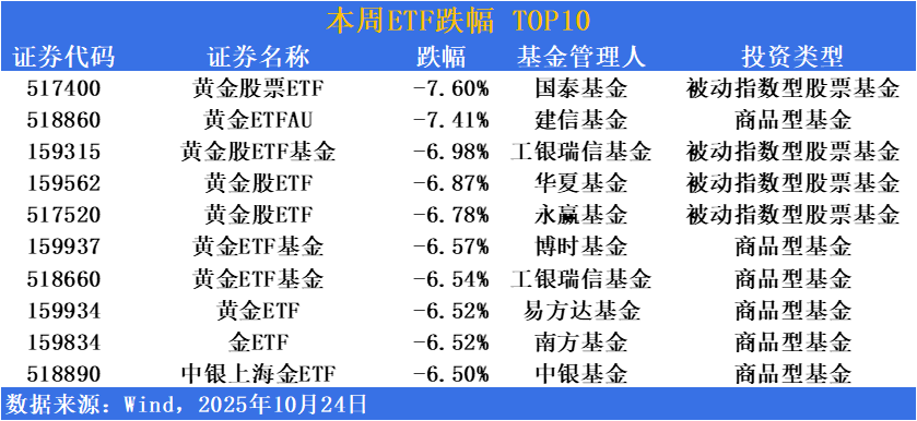 跌幅方面,地缘局势缓和,黄金相关ETF回撤明显