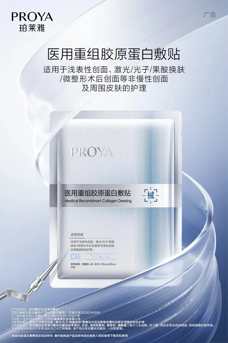 珀莱雅的医用重组胶原蛋白敷贴,精准抓住了医美术后正常肌肤也可能爆发敏感的痛点,不仅采用专利XVI型重组胶原,宣称“100%人体肌肤同源,深入基底促愈韧屏障”,还搭配专研医用亲肤膜布,采用药用级纯化水制作,强调“6大无添加”,适用范围覆盖浅表性创面、激光/光子/果酸换肤/微整形术后创面等非慢性创面及周围皮肤的护理,完美契合术后修护的“安全、温和、高效”需求。