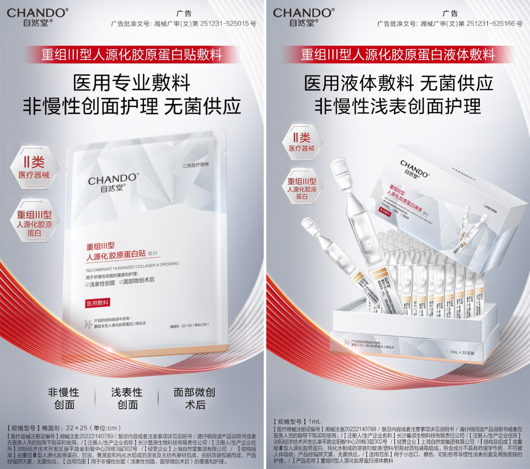 8月,自然堂则一次性推出两款械字号新品,重组III型人源化胶原蛋白贴敷料与重组III型人源化胶原蛋白液体敷料。