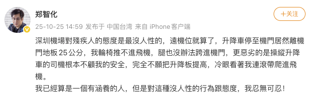 10月25日下午,郑智化在微博发文称,自己当日在深圳机场乘坐深航ZH9073航班前往台北时,升降车升至机门后离机门地板有25厘米距离,导致其轮椅无法推入飞机。他指责操纵升降车的司机不愿把升降板提高,致使自己只能“连滚带爬”进飞机,并怒斥这种行为“没人性”。该文一经发出,迅速引发网友热议。