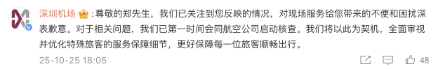 对于此次服务保障带来的不便,深圳机场再次表示歉意,并强调机场服务与旅客预期还有差距,将认真听取意见建议,持续改进优化。