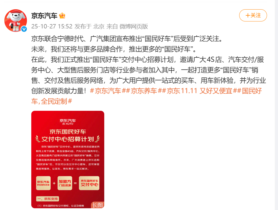 10月27日,@京东汽车 宣布启动“国民好车”交付中心全国招募计划。京东汽车将联合广大4S店、汽车交付/服务中心、大型售后服务门店等构建“国民好车”销售、交付及售后服务网络。