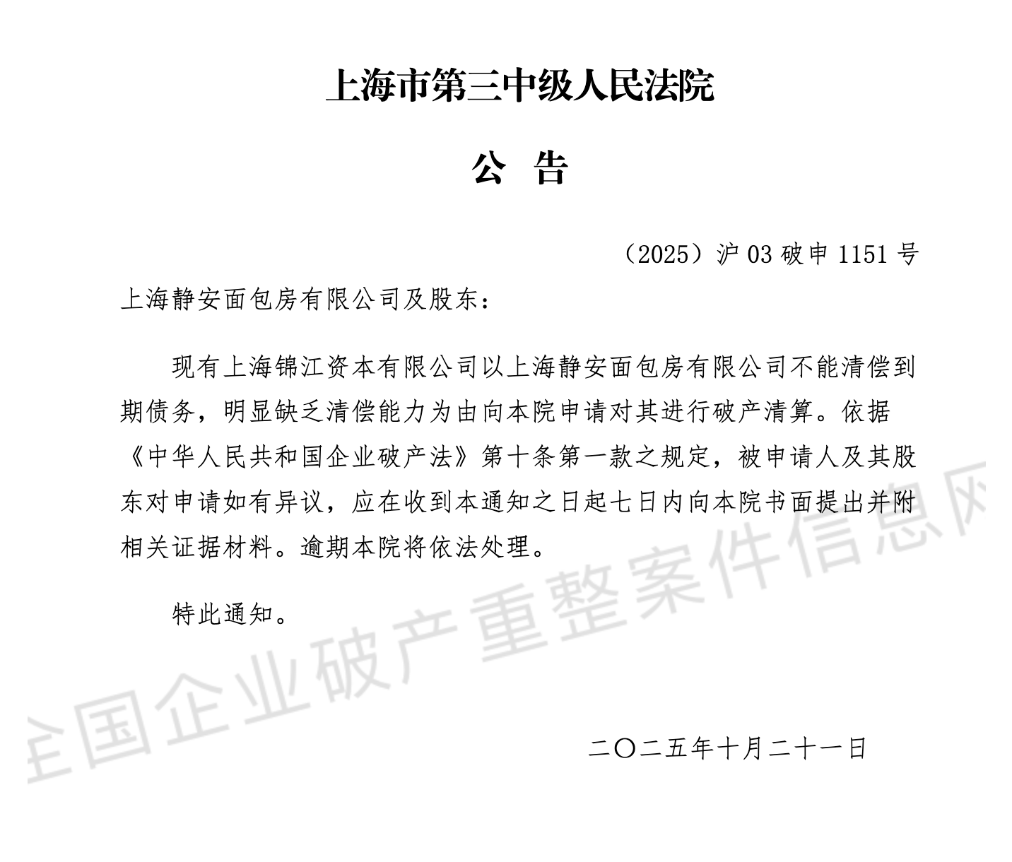 界面新闻注意到,上海市第三中级人民法院已于10月21日发布公告,上海锦江资本有限公司以“上海静安面包房有限公司(下称静安面包房公司)不能清偿到期债务,明显缺乏清偿能力”为由,向法院申请对其进行破产清算。