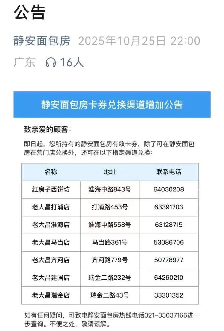 针对消费者关心的卡券使用问题,静安面包房于10月25日深夜在官方微信公号发布公告,明确有效卡券可在仍在营业的静安面包房门店,以及红房子西饼坊、老大昌等7家合作品牌门店兑换。这一跨品牌兑付举措,也被业内人士解读为“品牌资产清算前的过渡安排”。