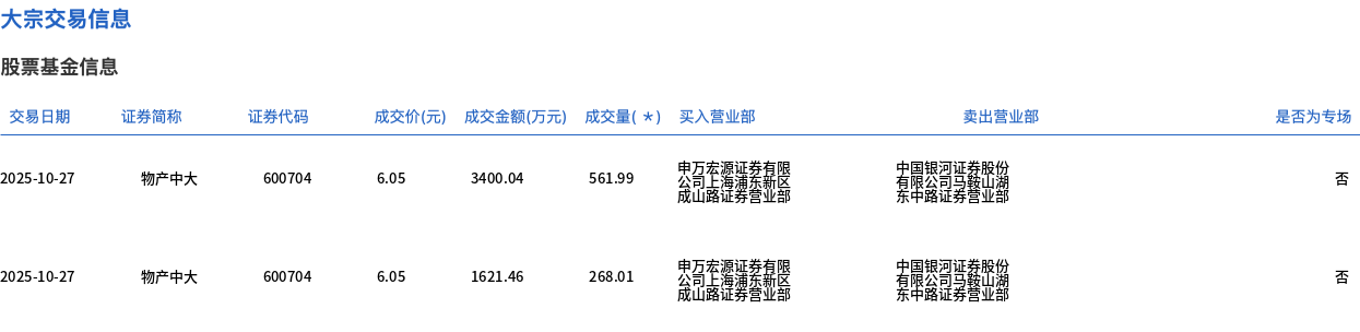 10月27日,物产中大大宗交易成交830万股,成交额5021.5万元,占当日总成交额的6.83%,成交价6.05元,较市场收盘价6.17元折价1.94%。