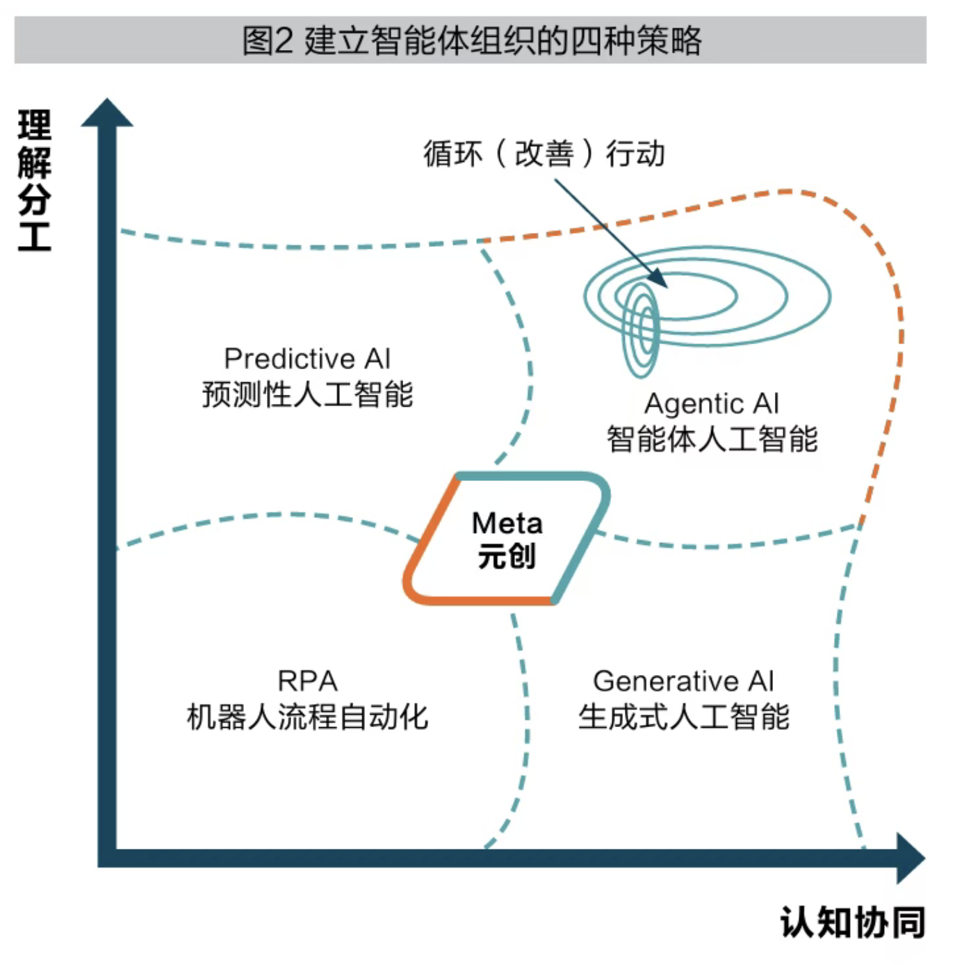 上述四种策略互不矛盾。例如,企业可以从RPA开始,然后根据业务性质部署预测性和生成式人工智能,这都可以为向智能体组织转型做好能力准备。融合四种策略,分阶段执行,是向机器智能学习的较好方法。