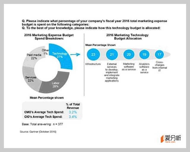 从图片的左下角可以看到,2016年底CMO在科技上投入平均占营收的3.2%,CIO的占比则是3.4%,两者已经非常接近,并且在2017年CMO的投入很可能会超过CIO。