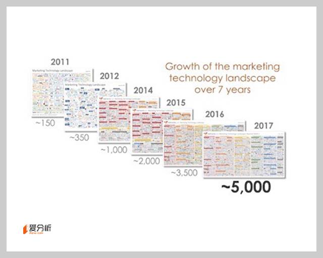 从市场参与者角度看。Martech Conference创办者Scott Brinker从2011年开始每年都会制作一张Martech的全景图,可以看到这个行业的公司从2011年的150家发展到今年的5000家左右,发展速度惊人。