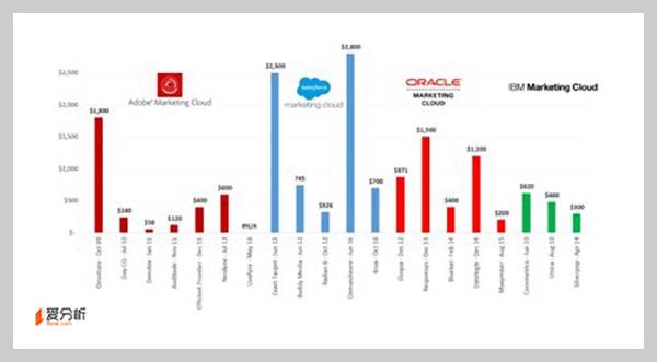 从投资并购角度看。从2010年到2015年,Martech领域里总共获得1340亿美元融资,并且从2012年开始,主要厂商的时候的收购开始变得越来越活跃。