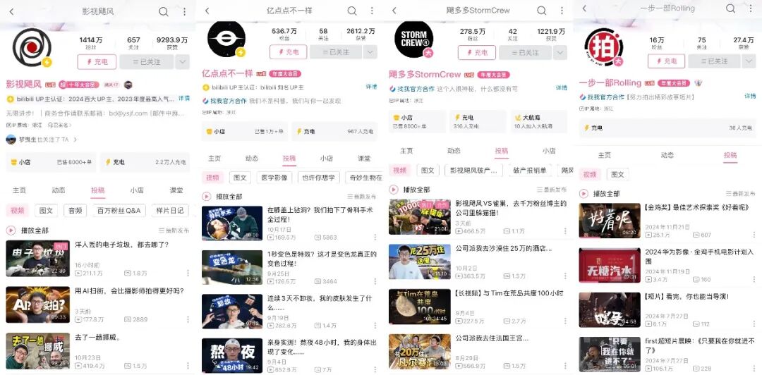 最显著的是影视飓风开始发力内容矩阵账号,目前以“长/短视频”为X轴、“大众/专业”为Y轴,公司分别在四个象限做了内容账号布局,影视飓风对应的是“长视频/专业”。