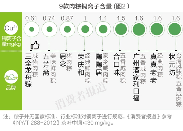 目前,国家标准已取消了对食品中铜含量的限量标准。对于粽子类食物,仅在商务部于2004年颁布的商业行业标准《SB/T 10377-2004》中有要求,不过该标准同样对铜离子并没有限制。《消费者报道》此次参考了茶叶农业标准《NY/T 288-2012》中对于铜离子的限制≤30mg/kg进行评定。