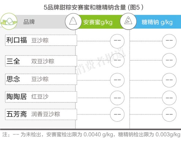 此次本刊检测结果显示,在5款甜粽中均未检出安赛蜜和糖精钠,看来大品牌产品安全性较好。(如图5)
