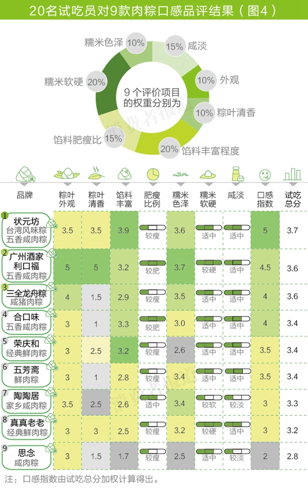 品评结果显示,状元坊在多个指标表现较好且馅料最为丰富,最受试吃员青睐;广州酒家粽子长得最“俊”但也最“塞牙”和肥腻;思念的肉粽馅料最少,难以寻觅鲜肉;而荣庆和的肉粽最“照骗”,仿佛美景永远活在朋友圈里。(如图4)