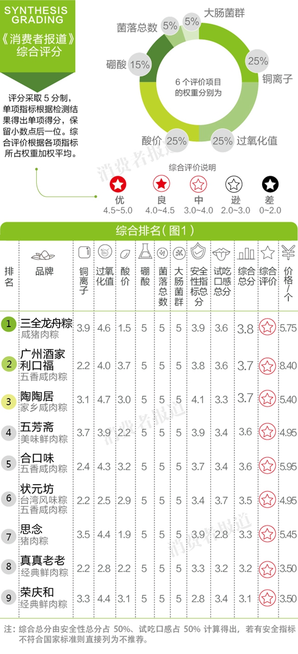 2017年5月,《消费者报道》向第三方权威检测机构送检了三全、五芳斋、思念、荣庆和、陶陶居、合口味、广州酒家利口福、真真老老、状元坊等9品牌9款肉粽和5款甜粽。样品选择既包括老字号,也包括电商销量较大的品牌。