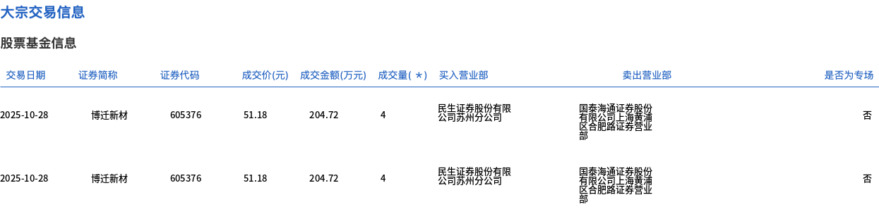 10月28日,博迁新材大宗交易成交8万股,成交额409.44万元,占当日总成交额的0.97%,成交价51.18元,较市场收盘价56.15元折价8.85%。