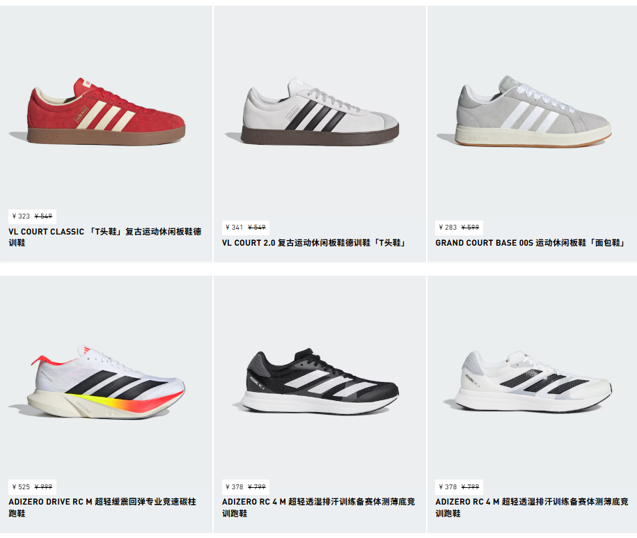 在产品上,一度爆火的潮流Samba开路,让阿迪触底翻身。其定价维持在1000元以下,促销折扣下,部分款式可达300-600元一双,平替版本VL COURT系列更是进一步将价格拉低至200-500元区间,赢得消费者热捧。