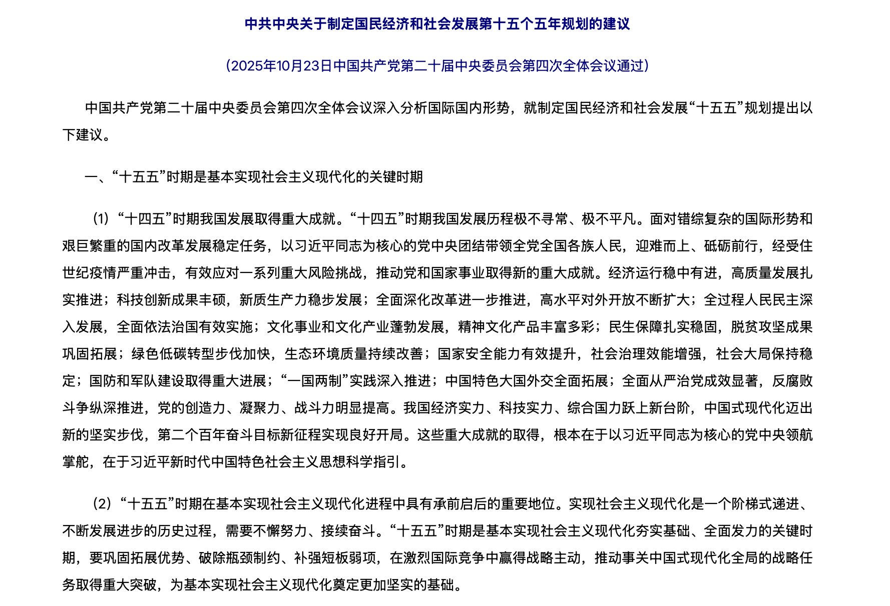 10月28日,新华社发布《中共中央关于制定国民经济和社会发展第十五个五年规划的建议》(下称《建议》)。