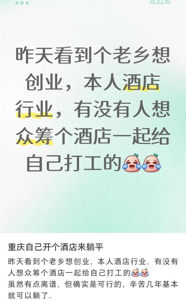 在小红书等社交平台,一批投资人重新将目光投向酒店众筹这一领域,其中年轻新一代投资人居多。