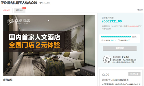 2015年,亚朵与淘宝网合作推出众筹项目,需要筹资200万,最终却吸引了5387人参与,筹资超过660万,超额完成330%。