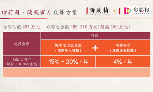 同年,度假酒店品牌诗莉莉在多彩投平台发起“阳朔诗莉莉漓筑蜜月精品度假酒店”的众筹认购,投资金额为330万元,众筹总金额为210万元。而仅在6天后,项目便筹集到399万元,达到最高限额,超出预期90%。