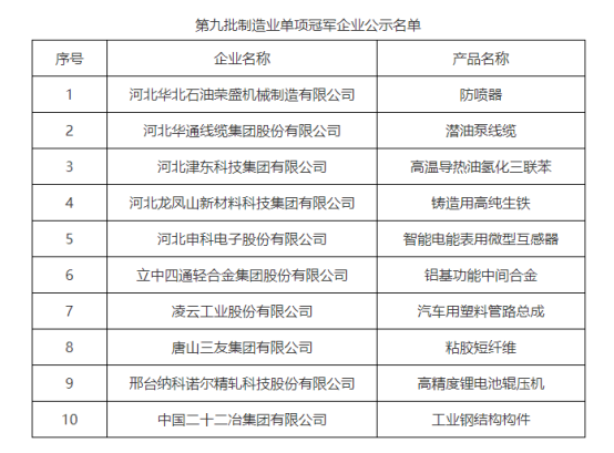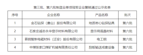 与此同时,河北省工业和信息化厅还发布了第三批、第六批制造业单项冠军企业复核通过公示名单。