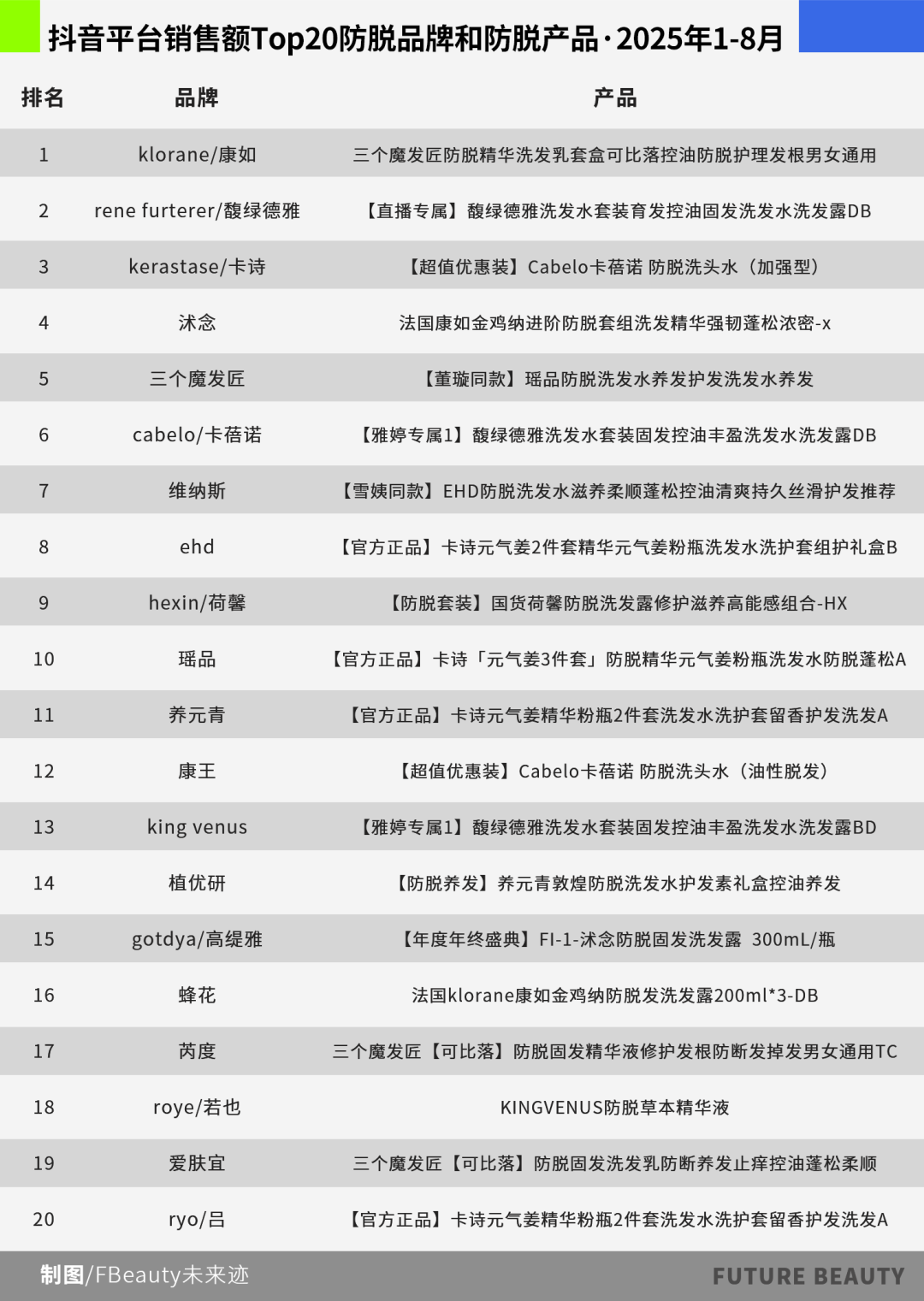 在抖音平台销量TOP20的防脱品牌中,康如、馥绿德雅、卡诗等国际品牌虽仍然占领头部,但主打高功效的新锐品牌如若也、“三个魔法匠”,以及专业防脱品牌卡蓓诺(Cabelo)、霸王,传统护发品牌蜂花、吕等均在销量前20的行列。