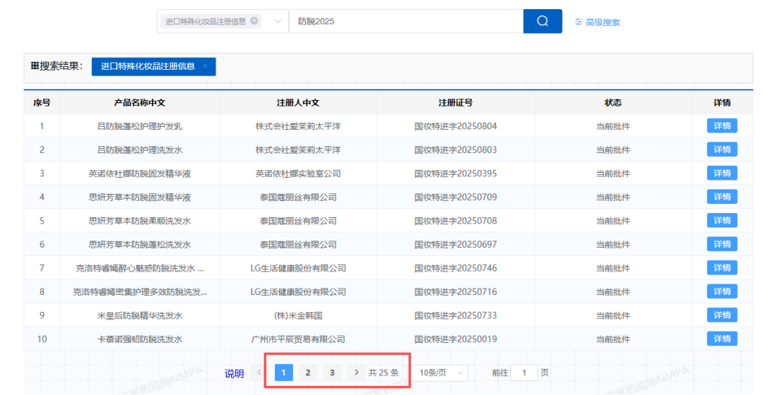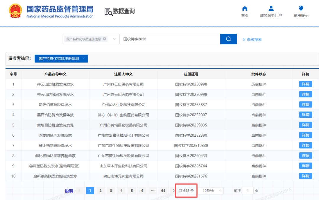 《FBeauty未来迹》通过在国家药监局官网检索“防脱+国妆特(进)字2025”发现,2025年至今一共有多达673个防脱产品拿到新特证,其中648个为国产特殊化妆品。