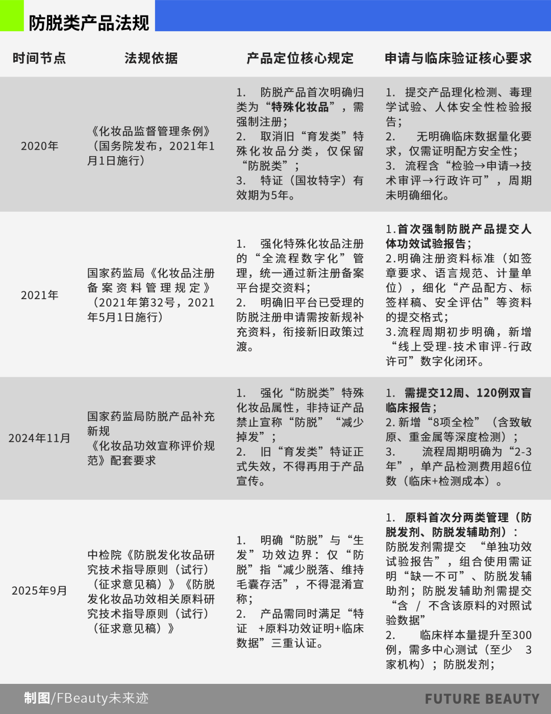 需求升级下,法规体系也在同步完善。2020-2025年间,防脱产品的监管完成了从粗放到精细的进化历程: