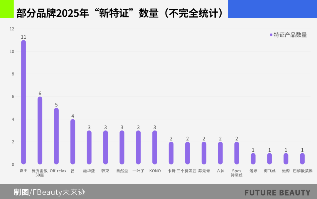 进一步对2025新证梳理发现:创立于1989年、主打防脱产品的中草药洗护品牌霸王,目前拥有行业最多的产品特证,达11个,产品涵盖防脱洗发液、防脱精华液、发膜全品类;曼秀雷敦五十惠、Off-Relax、吕等品牌在“第二梯队”,特证数量在4~6个之间;其余品牌大多持有三个及以内的“新证”防脱产品。