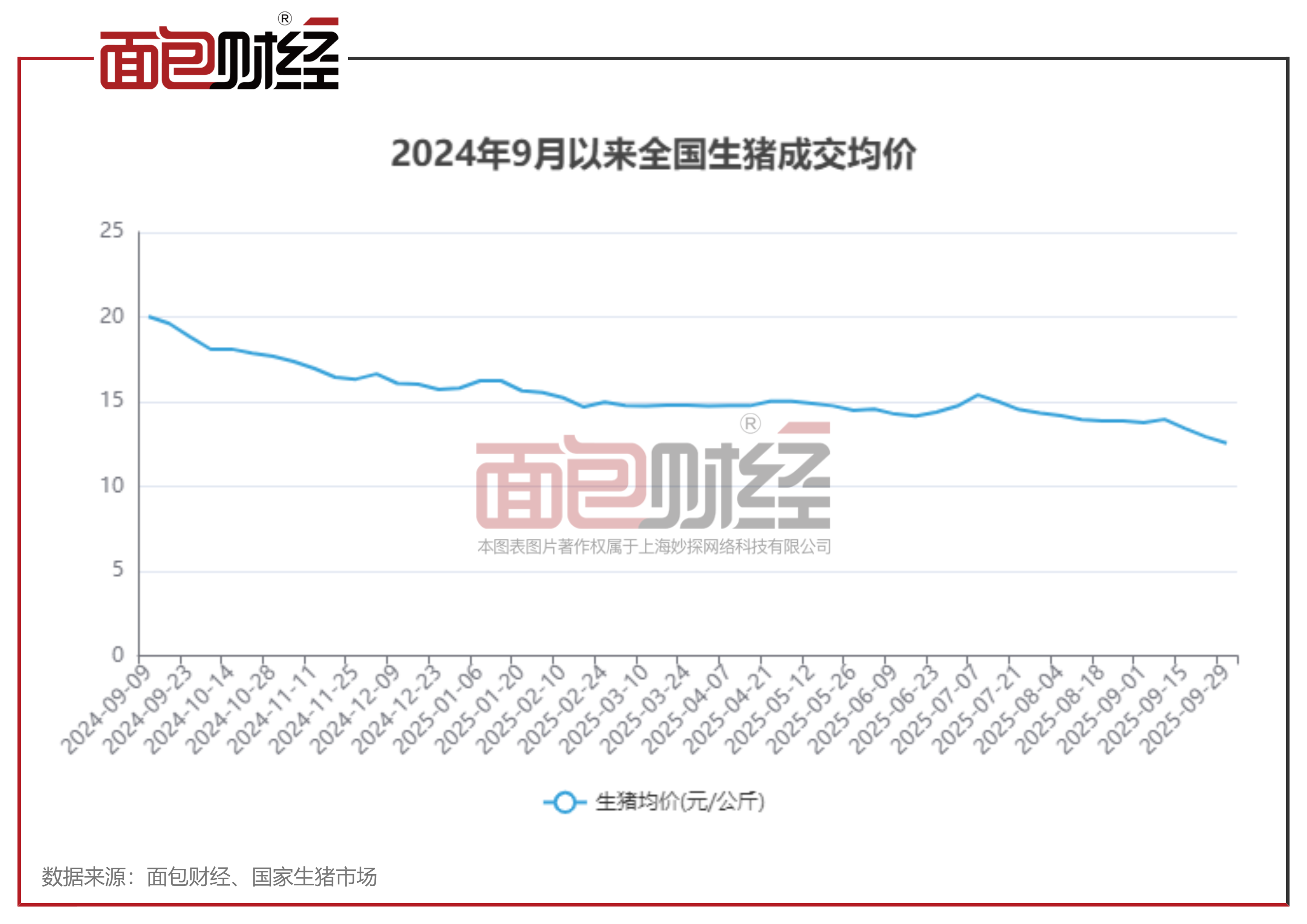 根据国家生猪市场披露的数据,全国生猪成交均价进入2025年以来相对稳定,7月以来出现波动下滑。2025年9月,生猪成交均价最低达到12.54元/公斤,较去年同期降幅较大。