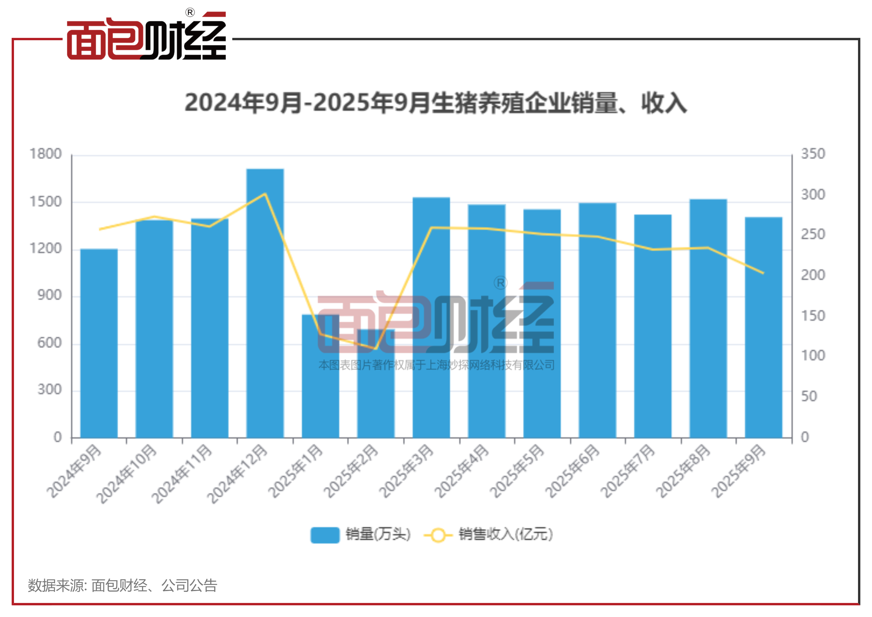 剔除部分数据缺失企业后,2025年9月,16家生猪养殖企业合计实现生猪销量1404.91万头,环比下降7.55%,同比上升16.8%。同期,生猪养殖企业合计实现销售收入为203.7亿元,环比下降13.4%,同比下降21.08%。