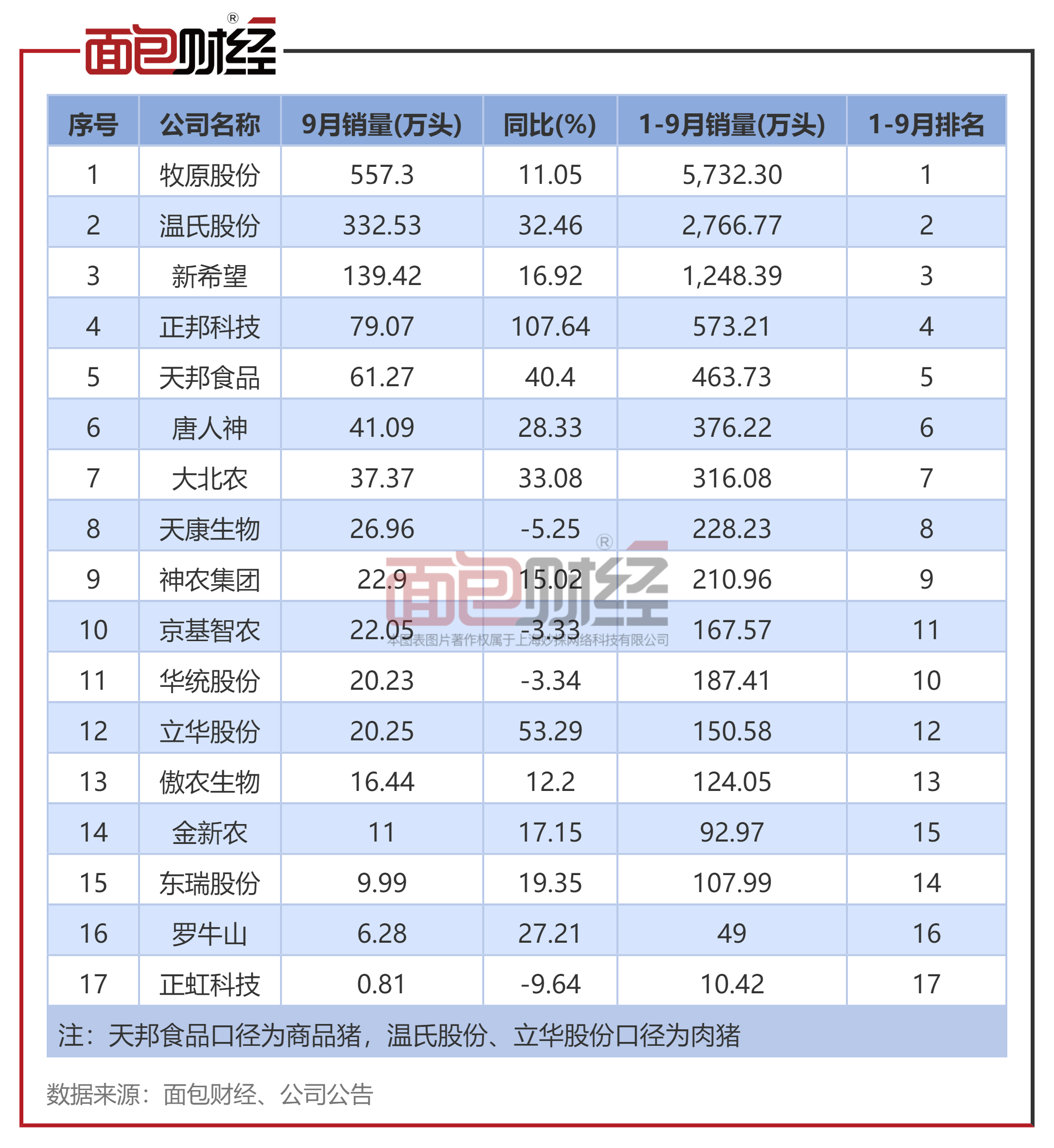 9月上市生猪企业销量同比上涨16.8%