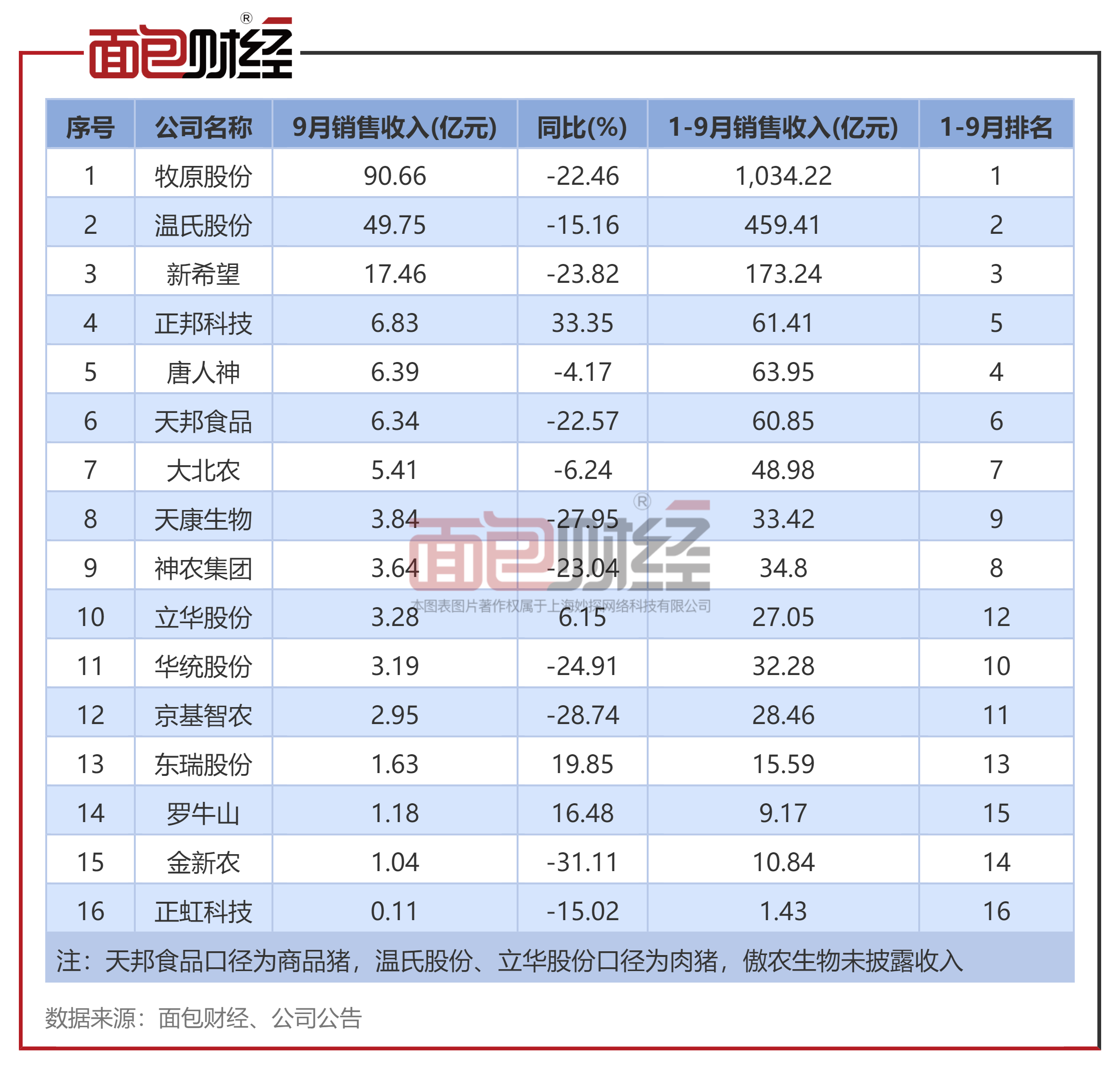 近期,生猪养殖企9月的销售数据陆续披露。面包财经研究员在剔除部分数据披露不全的上市猪企后,以沪、深两大交易所主要上市生猪养殖企业为样本,分别统计其生猪销售收入、销量。