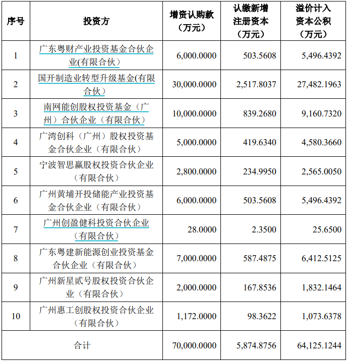 2024年3月,智光储能增资扩股,引入了包括国开制造业转型升级基金(有限合伙)、南网能创股权投资基金(广州)合伙企业(有限合伙)、广东粤财产业投资基金合伙企业(有限合伙)等在内的10位战略投资者。