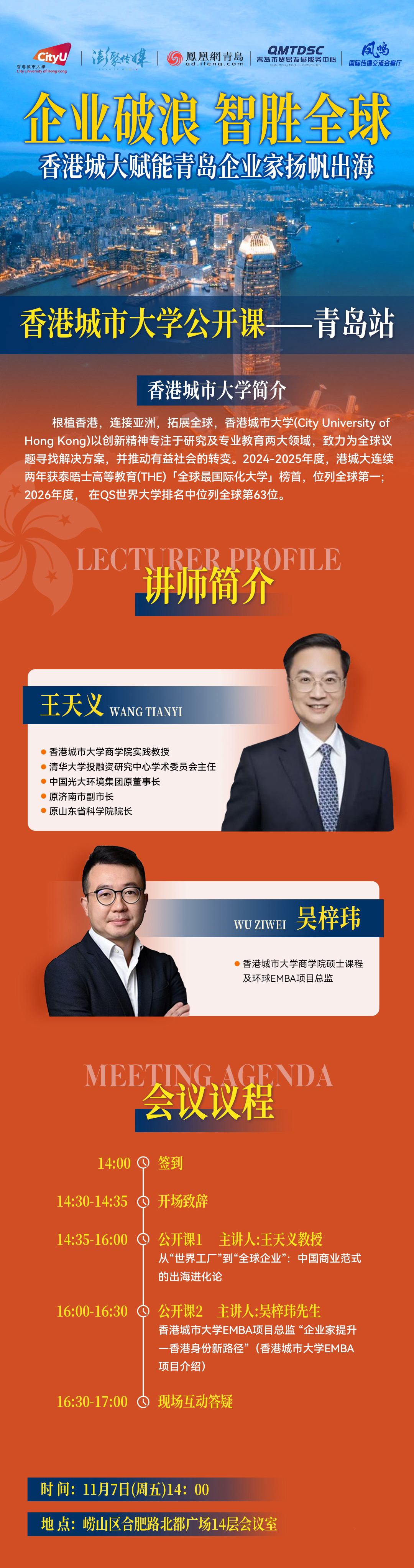 此次公开课的两位主讲人堪称“出海智囊天团”。王天义教授是香港城市大学商学院实践教授,曾任中国光大环境集团原董事长、原济南市副市长、原山东省科学院院长等要职,他将以《从世界工厂到全球企业:中国商业范式的“出海进化论”》为题,剖析中国企业从产品输出到模式输出的跃迁逻辑。另一位主讲人吴梓玮则是香港城市大学商学院硕士课程及环球MBA项目总监,他将解读《“企业家提升香港身份新路径”——香港城市大学EMBA项目》,为企业管理者搭建全球化学习与资源整合的平台。