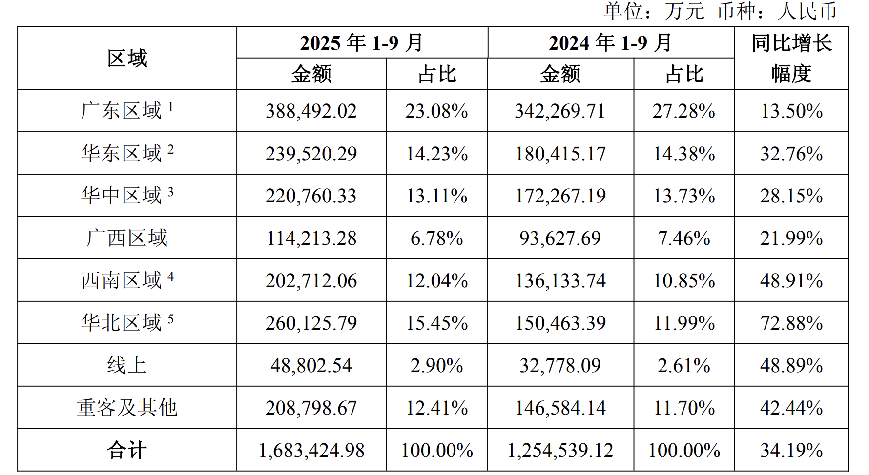 (广东区域增速放缓,华北、西南保持高增速,图:东鹏饮料2025前三季度经营数据公告)