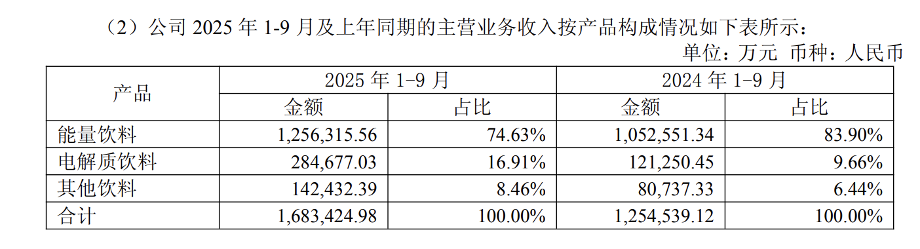 财报显示,“东鹏补水啦”前三季度收入猛增134.8%,达28.47亿元,占比升至16.9%;“其他饮料”的收入也从8.07亿元增长到14.24亿元,增幅达到76.5%。