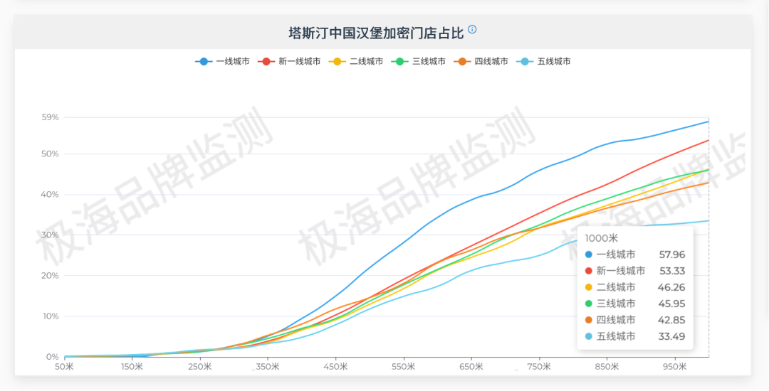 如今,塔斯汀在单位区域的门店数量,正在肉眼可见的增加。海品牌监测数据显示,目前在一线城市,500米的范围内,有两家塔斯汀门店的概率为21.95%,新一线、二线和三线城市分别为14.59%、12.93%和13.71%;1000米的范围内,这一数据分别上升至57.96%、53.33%、46.26%和45.95%。