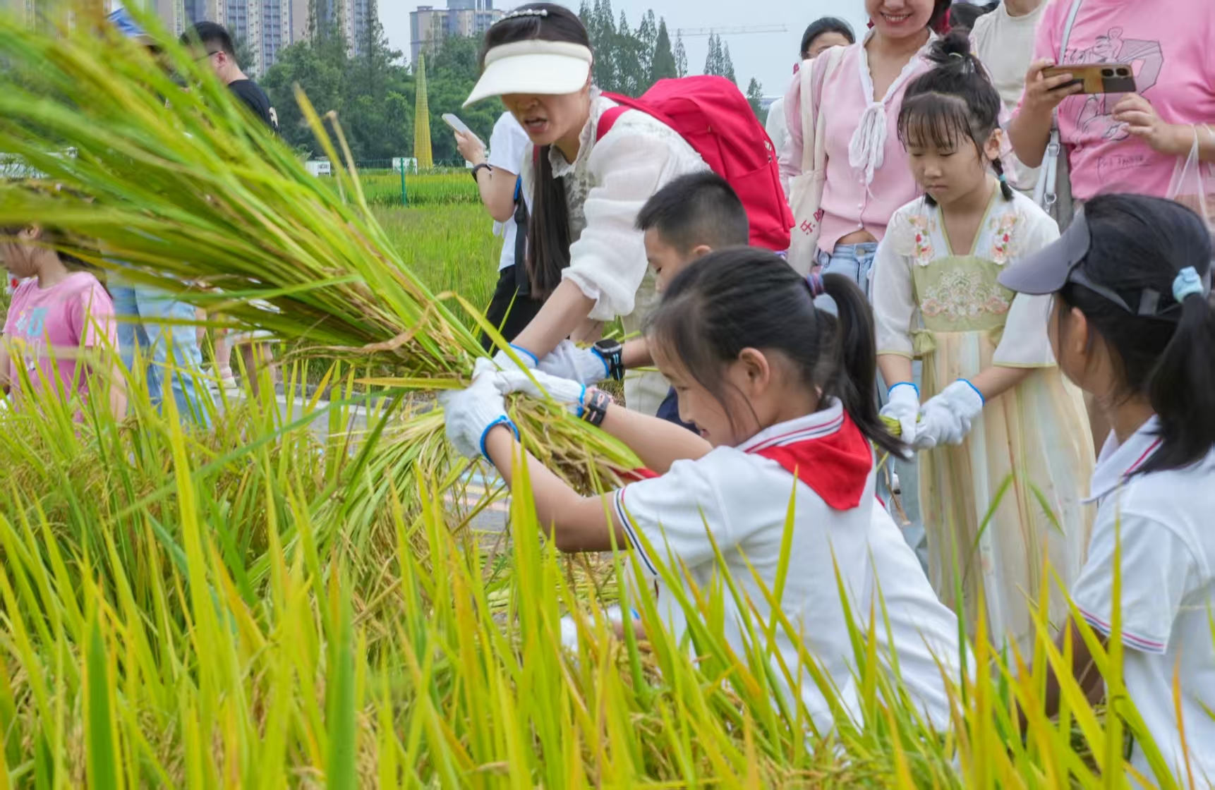 9月7日,在袁隆平杂交水稻科技园里,亲子家庭携手开启农耕探索。孩子们随讲解员回溯“水稻的一生”,了解杂交水稻对国家粮食安全的意义。田间,亲子携手挽袖,共同收割金黄的稻穗,在他们弯腰起身间,直观感受“春种秋收”的节律,亲身体会“锄禾日当午”的辛劳与不易。活动引导大家齐声诵读袁隆平院士的“禾下乘凉梦”寄语,让惜粮敬劳的种子在亲子共学的温馨氛围中深深扎根。