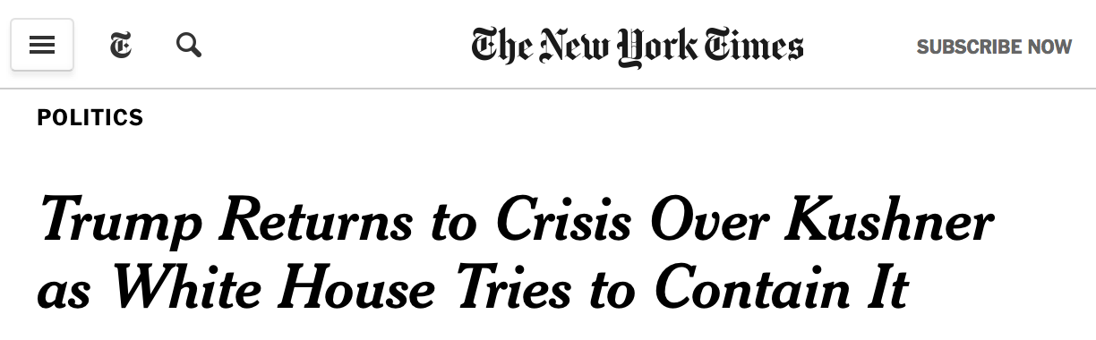 特朗普在外访问期间风波不断,其中最紧急的莫过于其女婿库什纳(Jared Kushner)卷入“通俄门”并面临调查。白宫已取消原定于几天后的艾奥瓦州访问,加紧制定一项应对危机的计划,扩大法律团队,重组联络办公室成员。