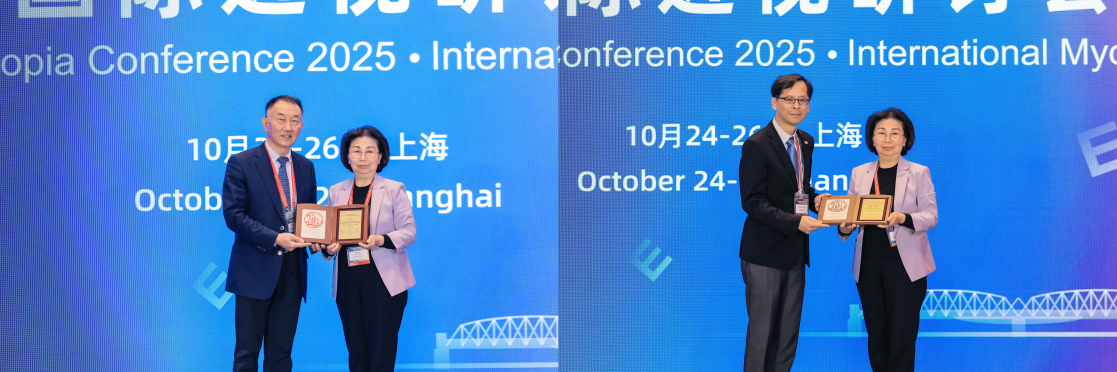 郑广瑛院长表大会,向在眼科领域及近视防控研究中做出卓越贡献的复旦大学眼耳鼻喉科医院孙兴怀教授与新加坡国立大学Ching-Yu Cheng教授颁发了荣誉证书。
