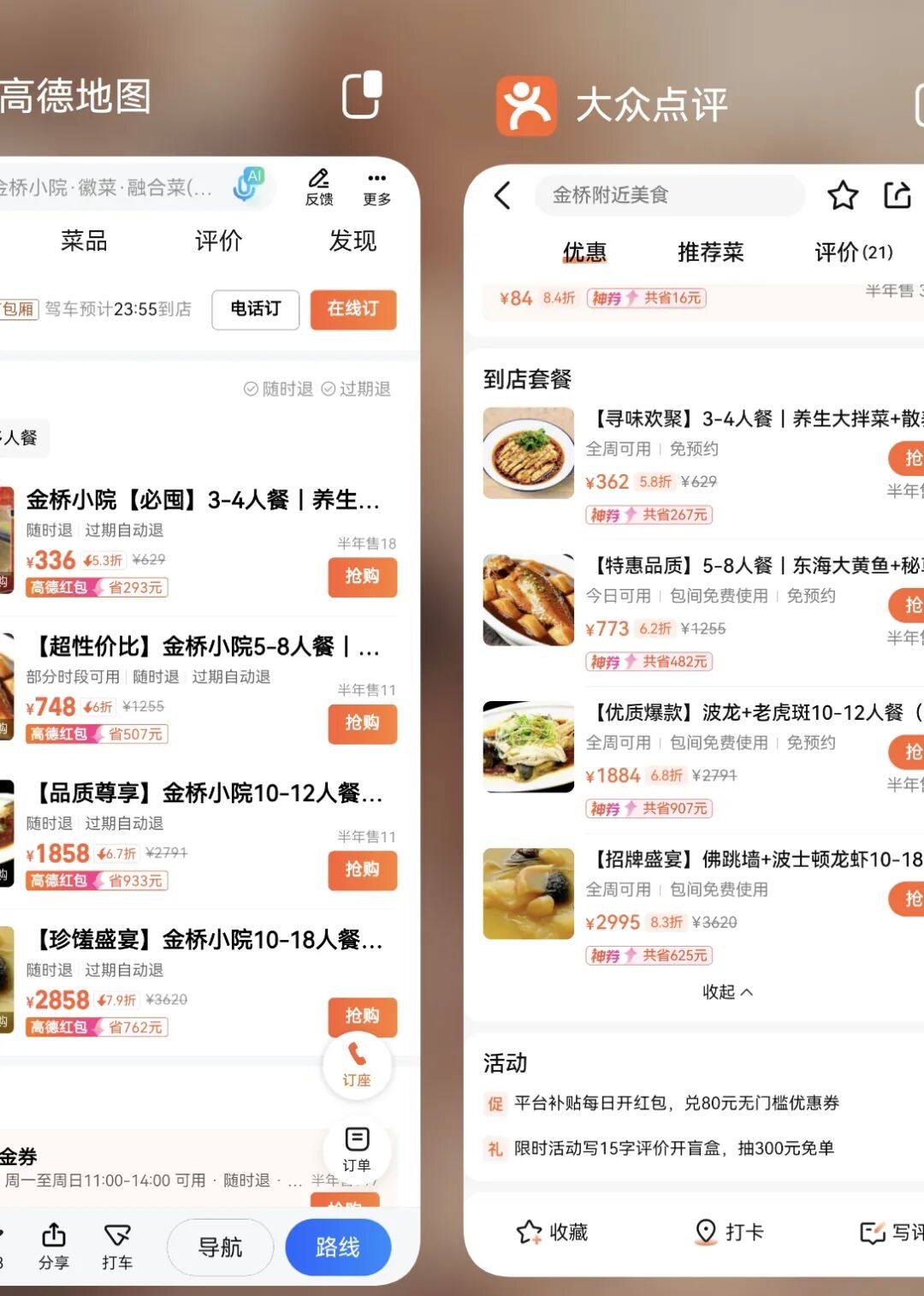 例如,同为金桥小院店铺四款团购套餐中的10~18人餐,高德团购价为2858元,大众点评则需要2995元,便宜一百多元;其余三款套餐,高德也比大众点评便宜30元左右。