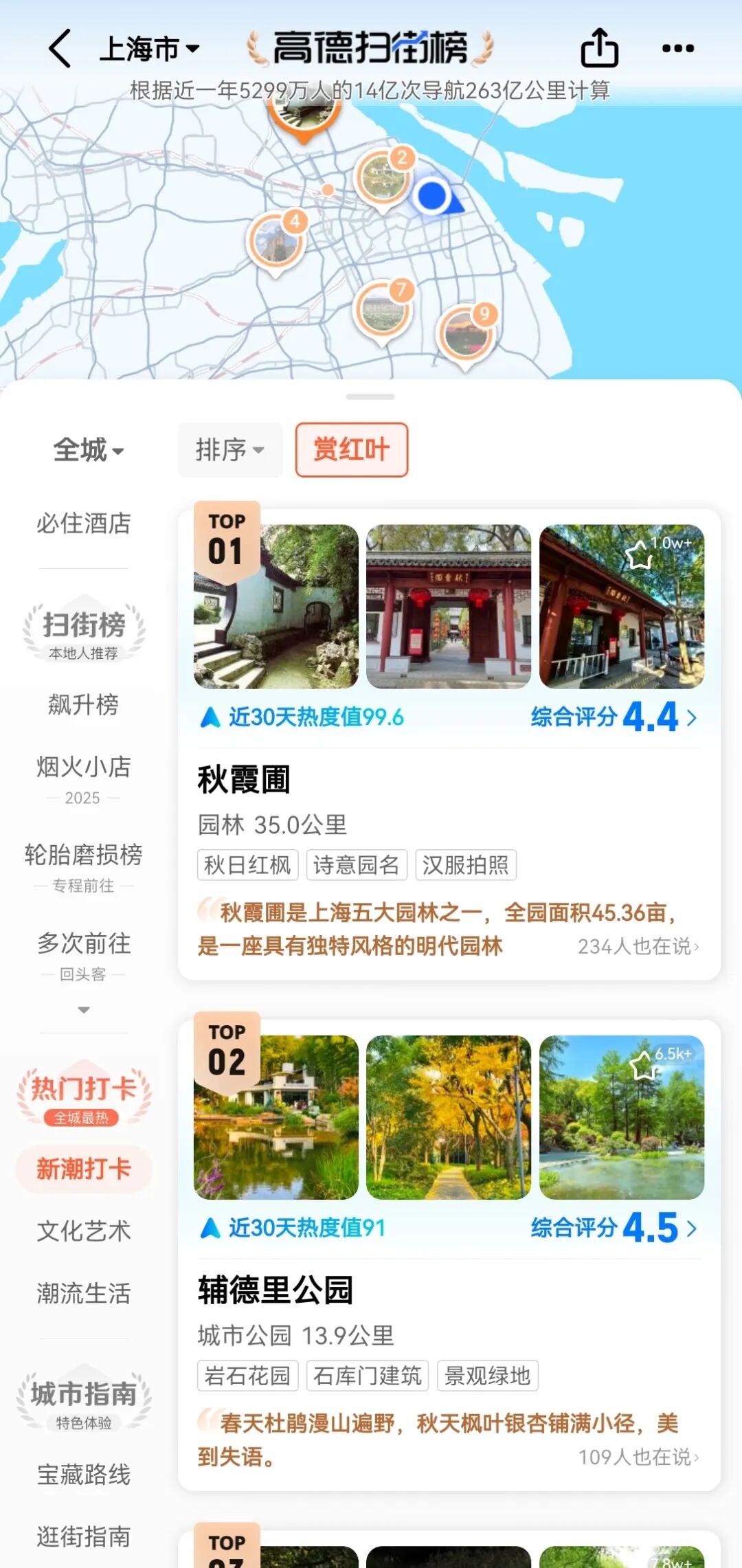 第二战的争夺点是榜单内容。记者注意到,许多平台结合场景推出各具特色的细分榜单。如今,打开高德扫街榜,在上海地区,最先进入的是“赏红叶”榜单,沪上的公园和周边景点都榜上有名。结合自身的地图优势,高德还推出“城市指南”榜单,沿线的景点、美食、夜市等都被整合进导航路线中,提供一站式的出行建议。