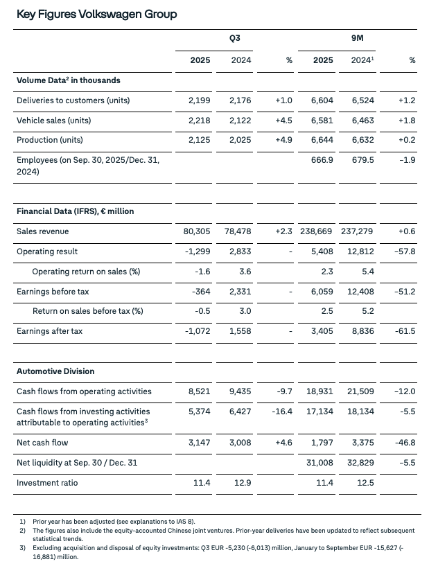 10月30日,大众汽车集团发布2025年第三季度财报:汽车交付量219.9万辆,同比增长1.0%;营收803.05亿欧元,同比增长2.3%;营业亏损12.99亿欧元,上年同期营业利润28.33亿欧元;汽车部门经营现金流85.21亿欧元,同比下降9.7%。