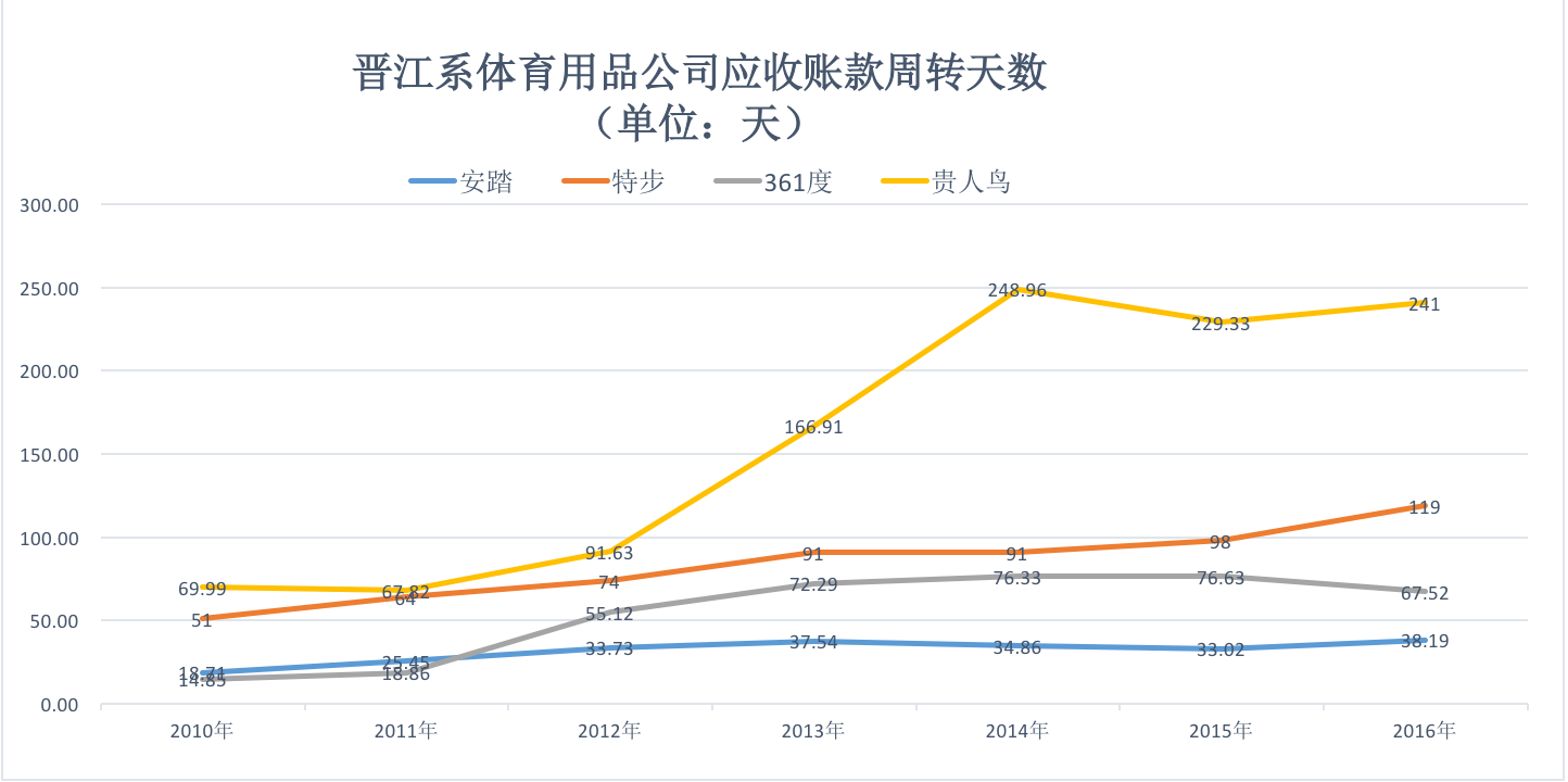 应付账款周转率方面,自2010年至今,安踏的应付账款周转天数始终低于其它四家鞋类公司,且在2013年以后逐步减少。