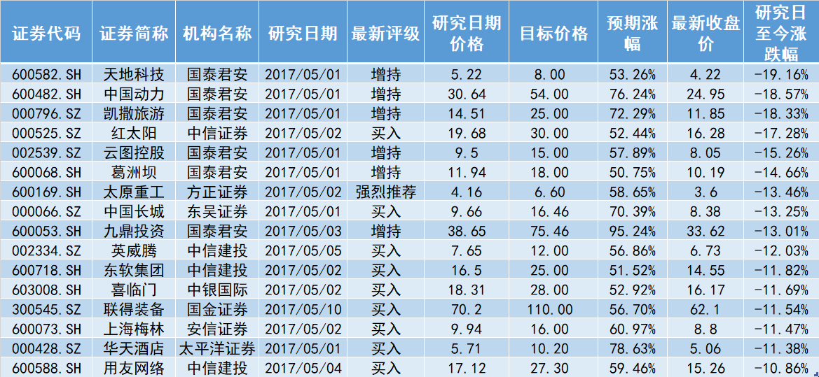 然而,虽然券商分析师十分看好上述个股,但若以分析师发布研报中的个股研究日为参考,近一个月内获得券商给予“买入”或(或机构同等)评级且预期股价涨幅超50%的个股中,16只个股自研究日起至今的股价跌幅却超过10%,这似乎给这些个股的股价未来能否如期上涨带来些许压力。