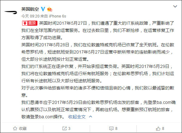 此前,英国27日遭遇罕见大面积航班系统网络故障,英国航空公司宣布取消当天17点前从伦敦希思罗及盖特威克两大机场出发的所有航班。27号,英国航空公司发言人称,英国航空公司电脑系统出现全球性的故障,导致该公司航班大面积延误。英航表示,正在努力修复故障,争取28号恢复大部分的航班。