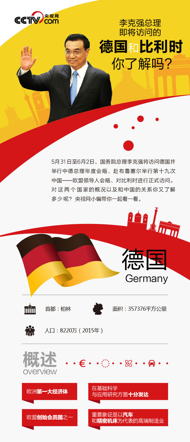 5月31日至6月2日,国务院总理李克强将访问德国并举行中德总理年度会晤、赴布鲁塞尔举行第十九次中国—欧盟领导人会晤、对比利时进行正式访问。对这两个国家的概况以及这两个国家和中国的关系,你了解多少呢?