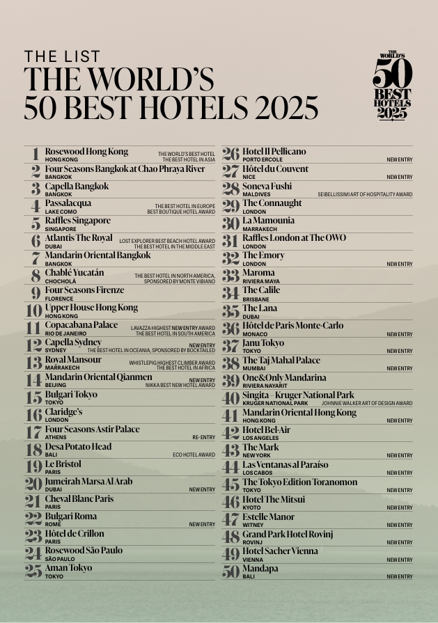 以下位2025年“全球50最佳酒店”完整榜单